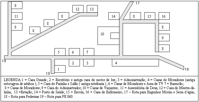 O engenho possui 127 casas, distribuídas nas ruas Assembléia, Campo, Catorze, Brasilit, Estalagem e Estação, além de outros locais mais afastados da área principal, onde moram cerca de 740 habitantes.